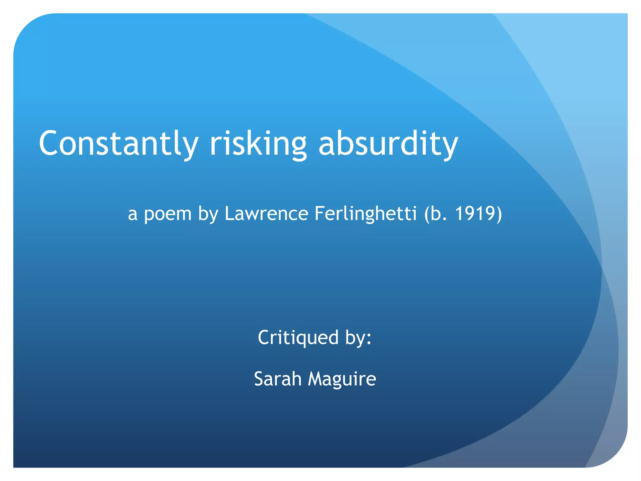 Ferlinghetti's poem "Constantly risking absurdity" uses unconventional structure and meter to convey the risks a poet takes to perform above their audience. The poet is likened to an acrobat, balancing on a high wire above a sea of faces and performing tricks without mistake. The choppy line breaks and spacing mimic an acrobat's movements. In the second half, the poet is described as a "super realist" striving for beauty, but they may fail to "catch" its form. The unconventional form serves the message of risking failure to attain higher ideas.