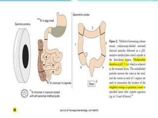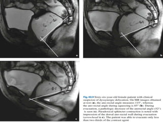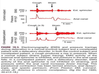 Chronic constipation is defined as symptoms lasting at least 3 months. Diagnosis involves assessing stool frequency and form, straining, incomplete evacuation, manual maneuvers, and excluding other causes. Tests evaluate anorectal physiology including balloon expulsion, manometry, defecography and transit studies. Treatment involves lifestyle changes, biofeedback, prucalopride, surgery for severe cases. Indian definitions differ based on stool characteristics and transit times.