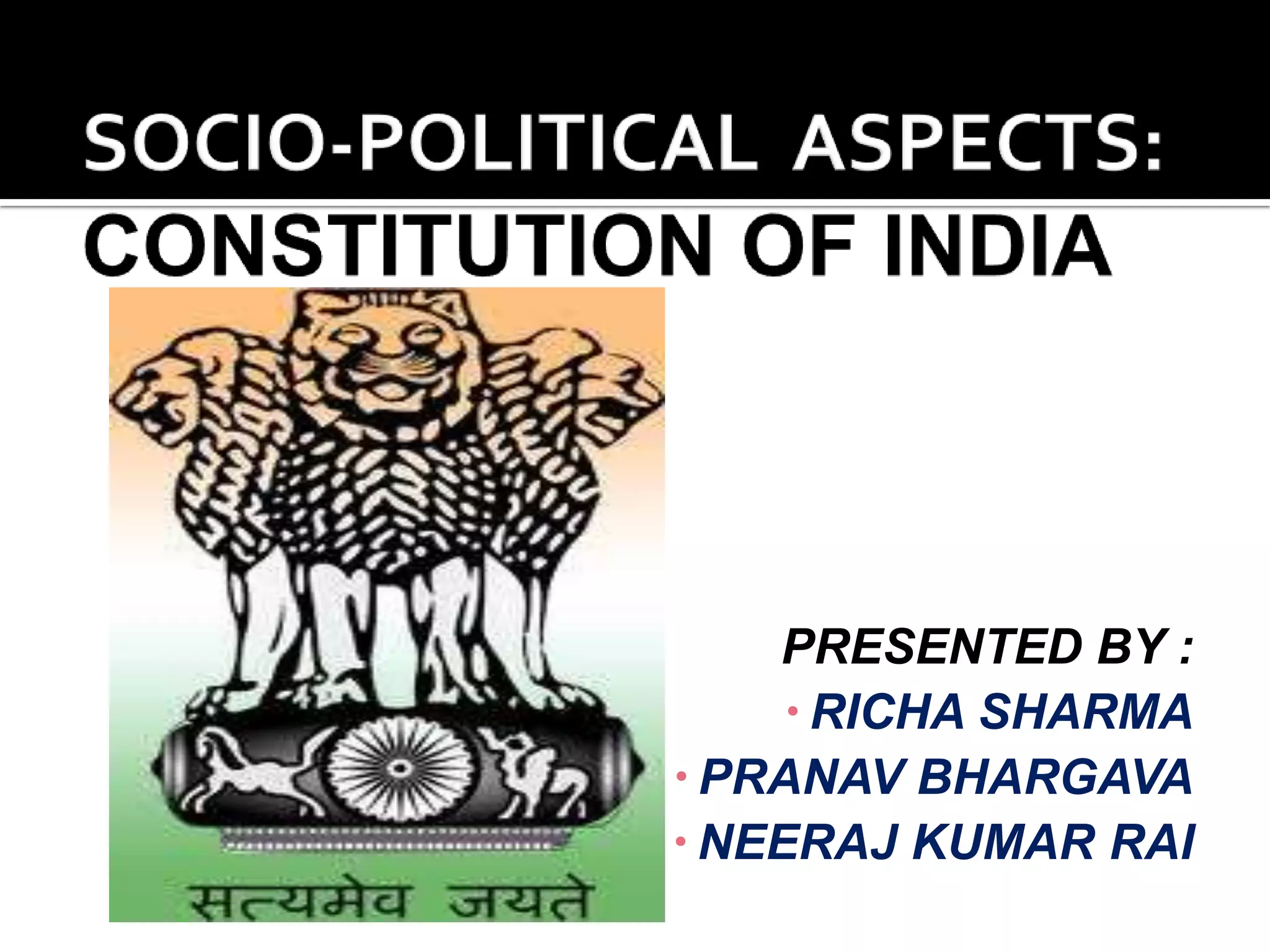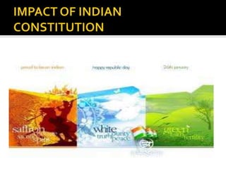 The document provides an overview of key aspects of the Indian constitution and government. It discusses how the constitution establishes India as a sovereign democratic republic and guarantees fundamental rights and directive principles. It also summarizes India's adoption of a parliamentary system of government with a federal structure consisting of 28 states and 7 union territories.