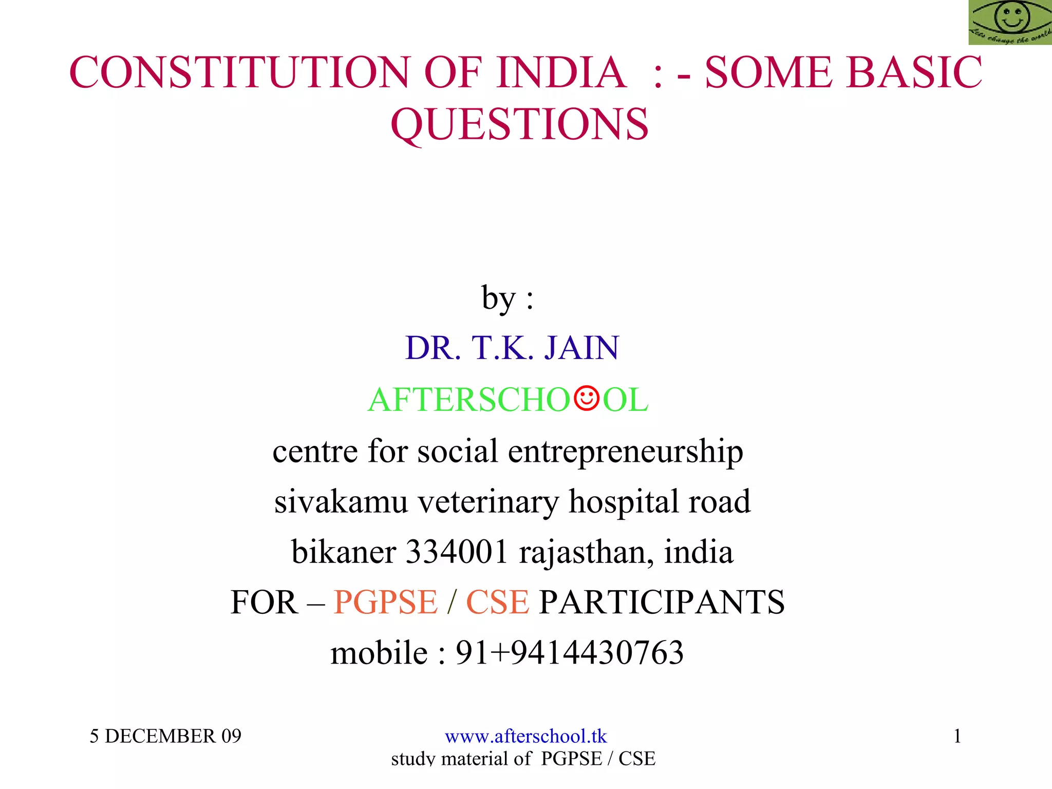 The document provides a summary of 22 questions related to the Constitution of India. It discusses key topics like fundamental rights vs directive principles, the basic structure doctrine, emergency provisions, distribution of legislative powers between the centre and states, judicial review and writ jurisdiction. The questions cover topics like the number of lists in the Constitution, tax powers, citizenship rights, amendments and the roles of different courts.