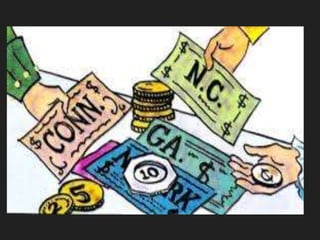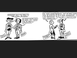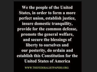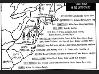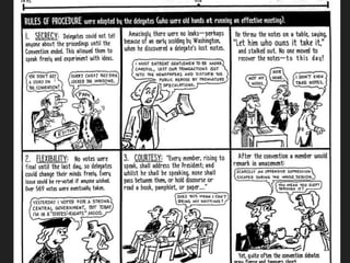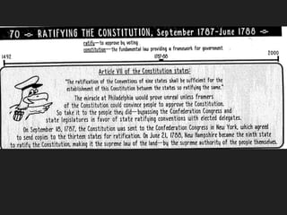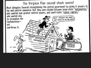 The document discusses the Articles of Confederation, the first attempt at a national constitution after the American Revolution. It summarizes that the Articles created a weak national government with little power over the states. It then explains some of the weaknesses of this system, like conflicts between states over currency and trade. The document argues this showed the need to revise the Articles, leading to the Constitutional Convention of 1787 and the drafting of a new U.S. Constitution to replace the Articles of Confederation.