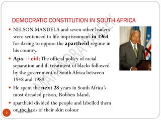 The document summarizes key aspects of the democratic constitution adopted in post-apartheid South Africa. It describes how Nelson Mandela and other leaders were imprisoned for opposing apartheid. After decades of struggle against apartheid by black, colored, and Indian groups led by the ANC, the racist policy was finally ended in 1994 when South Africa's first democratic elections took place. The new constitution was drafted through an inclusive process to build trust between the former oppressors and oppressed and protect the interests of all groups.