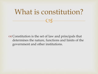 The document summarizes key features of Pakistan's 1973 constitution. It notes that the 1973 constitution introduced several new elements, including being a written document, making the Objectives Resolution a substantive part of the constitution, ensuring an Islamic system, and being relatively difficult to amend. It established a federal parliamentary system with a bicameral legislature, direct elections, fundamental rights for citizens, an independent judiciary, and authorization for referendums. The conclusion states it also aimed to protect and promote Islamic ideology like previous constitutions.