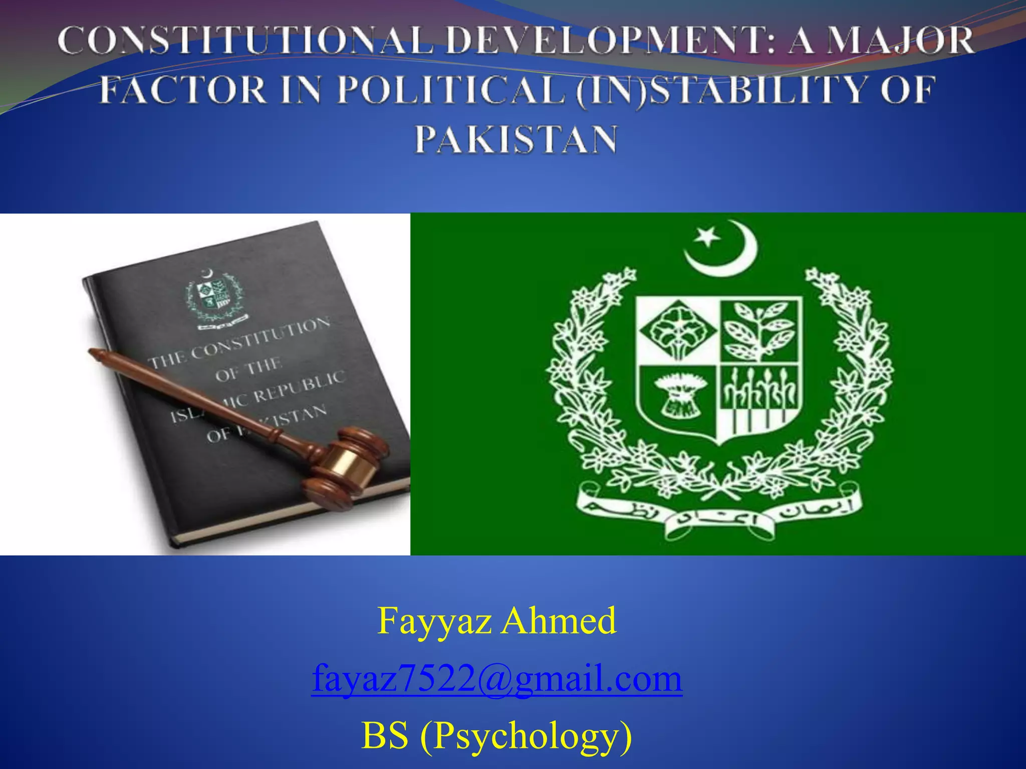 This document provides an overview of the constitutional development of Pakistan. It discusses the key documents that served as interim constitutions, including the Indian Independence Act of 1947 and the Government of India Act of 1935. It then summarizes the three main constitutions of Pakistan that were passed in 1956, 1962, and 1973, highlighting some of their main features. It also lists the Governors-General, Presidents, and Prime Ministers of Pakistan and provides brief biographies.