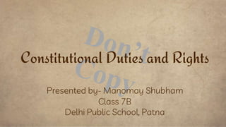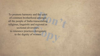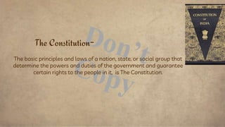 The document outlines the constitution of India, emphasizing its structure, which includes sections on fundamental rights and duties, citizenship, and various state provisions. It details the fundamental rights, such as the right to equality, freedom, and religion, as well as the fundamental duties added by amendments. It also highlights the right to constitutional remedies, which allows citizens to seek enforcement of their rights through the Supreme Court of India.