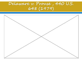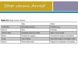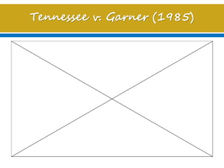 The document summarizes key Supreme Court cases related to searches, seizures, arrests, and use of force by law enforcement under the Fourth Amendment. It discusses the elements required for a constitutional seizure, search, or arrest. It also outlines what level of force is permitted in certain situations, such as establishing a roadblock, conducting a stop-and-frisk, or using deadly force against a fleeing suspect. The document analyzes several Supreme Court cases that address these issues, including Brower v. County of Inyo, Terry v. Ohio, Berkemer v. McCarty, and Tennessee v. Garner.
