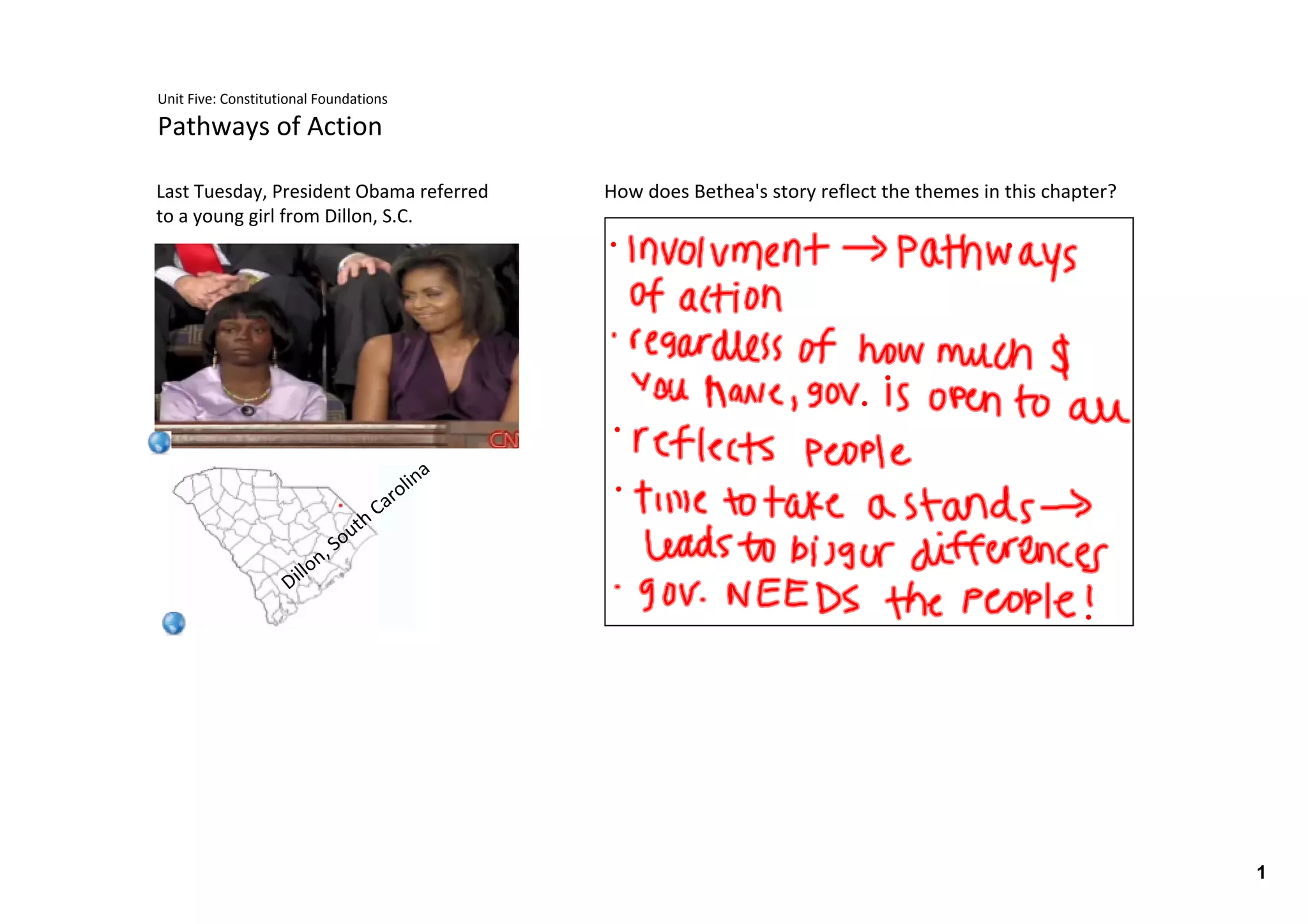 The document discusses constitutional foundations and pathways of action for shaping law and policy in the United States. It provides examples of how Americans have tried to shape the debate over abortion through various pathways such as elections, lobbying, courts, grassroots efforts, and cultural change. It also notes that stability in government relies on factors such as a broadly accepted framework, a stable political culture, and a variety of ways for citizens to achieve policy changes. Finally, it discusses how the actions of Tysheoma Bethea help illustrate why the US Constitution has lasted so long by providing a blueprint for over 234 years of government.