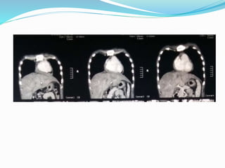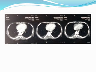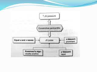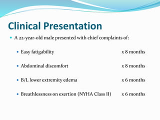 This document presents the case of a 22-year-old male who presented with symptoms of easy fatigability, abdominal discomfort, lower extremity edema, and breathlessness on exertion. Physical examination revealed cachexia, elevated jugular venous pressure, pitting edema, hepatomegaly, and elevated heart rate and respiratory rate. Initial testing suggested right heart failure and differentials included constrictive pericarditis, restrictive cardiomyopathy, and dilated cardiomyopathy. Further testing including echocardiogram, cardiac catheterization, and CT scan established a diagnosis of constrictive pericarditis based on findings of pericardial thickening and equalization of diastolic pressures between the right and left ventricles