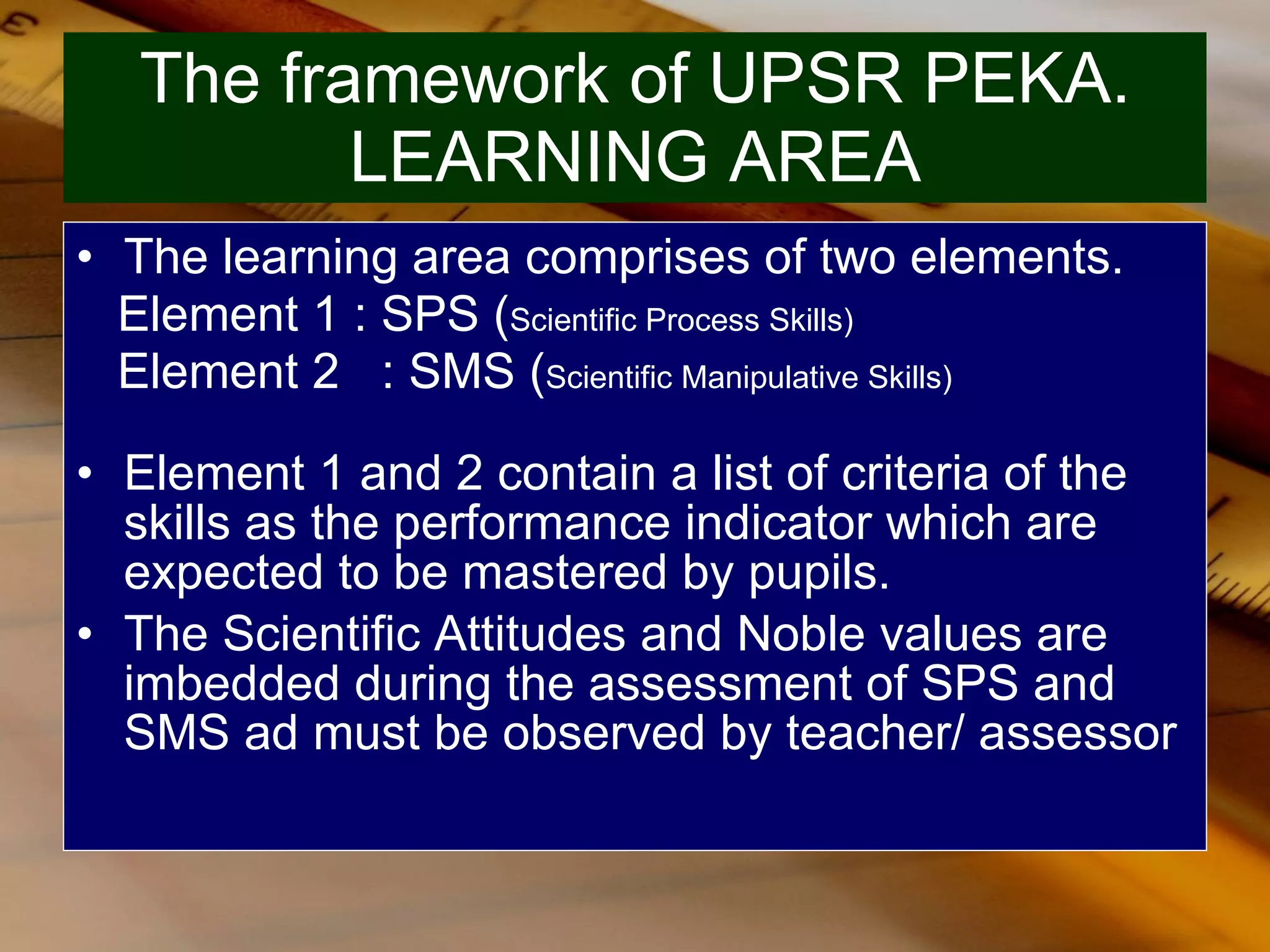 The document discusses several elements of a science curriculum framework including scientific process skills (SPS) and scientific manipulative skills (SMS). It provides details on four SPS: observing, classifying, measuring and using numbers, and communicating. For each skill, it lists criteria for performance levels and provides examples of how to apply the skills in classroom activities and assessments.
