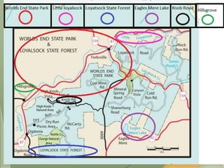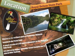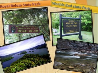 - The document discusses two state parks: Worlds End State Park in Pennsylvania, USA and Royal Belum State Park in Perak, Malaysia.