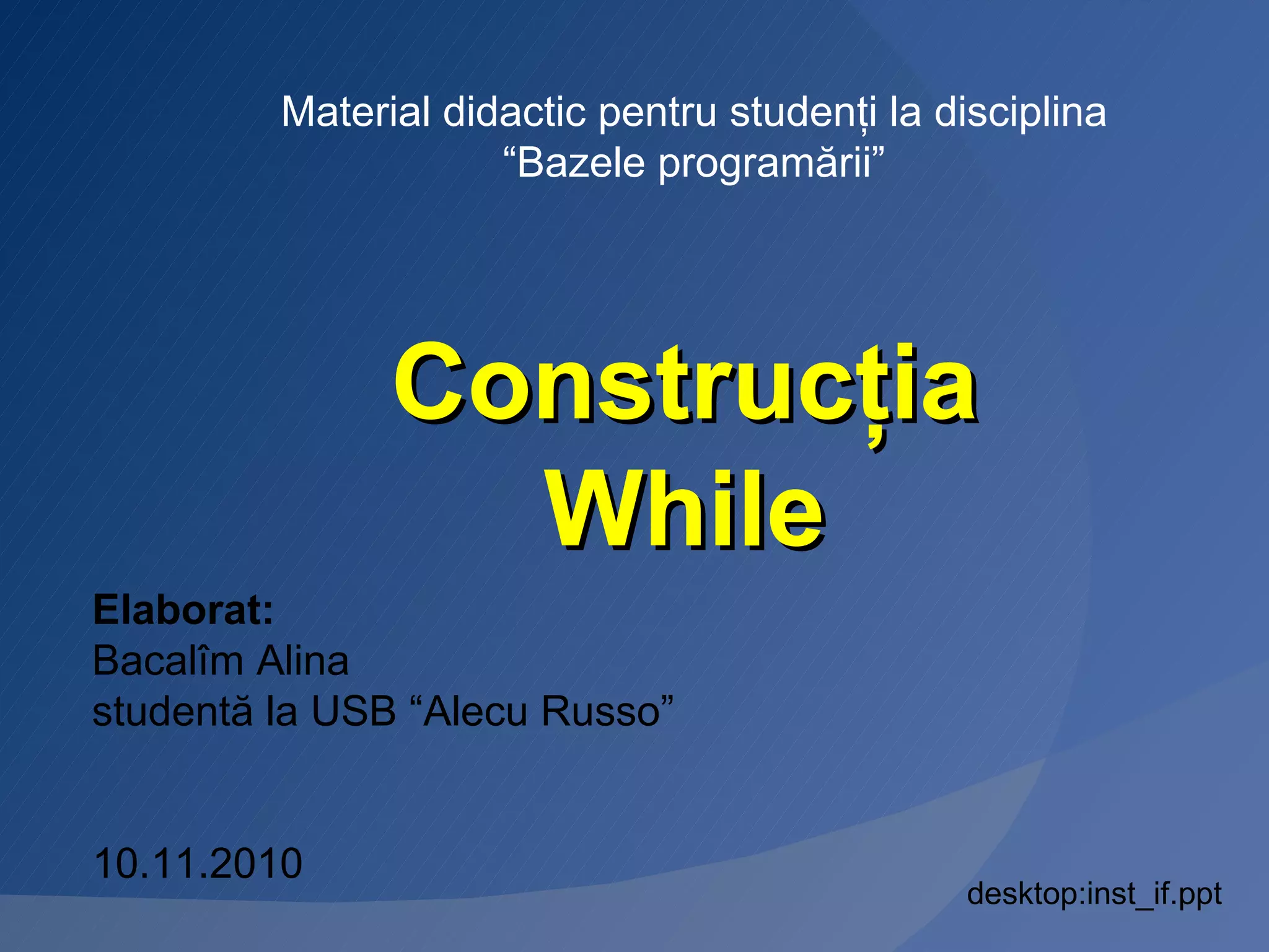 Documentul oferă o introducere în construcția ciclului 'while' în programare, explicând sintaxa și principiul de lucru al acestei structuri de control. Se detaliază organizarea ciclurilor cu un număr cunoscut și necunoscut de repetări, precum și echivalențele cu alte structuri de control precum 'repeat' și 'for'. Materialul este destinat studenților la disciplina 'bazele programării' și conține exemple ilustrative.