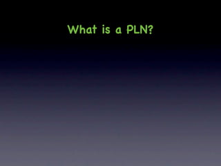 This document discusses how to construct a personal, professional learning network (PLN) online. It defines a PLN as a network of professionals where knowledge is shared. It highlights benefits like expanding horizons through more perspectives. It provides recommendations for where to start like Twitter and Ning, and how to find more educators by searching topics, seeing who others follow, and following favorite bloggers. It offers tips for joining conversations without fear, starting conversations by asking questions or sharing links, and keeping up using tools like Twitter Lists, TweetDeck, and URL shorteners.