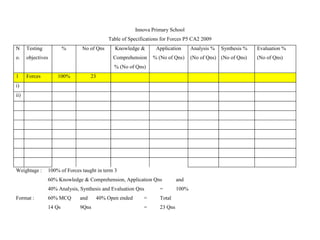 This document provides instructions for constructing a Table of Specifications (TOS) to outline the objectives and weighting for an exam. It details 3 steps: 1) Writing test objectives with action verbs and focusing on student performance. 2) Deciding the relative weight of each objective based on time spent and Bloom's Taxonomy classification. 3) Completing the TOS by listing objectives and draft weights, and percentages spent on education goals. The next session will cover designing a test paper based on a given TOS.
