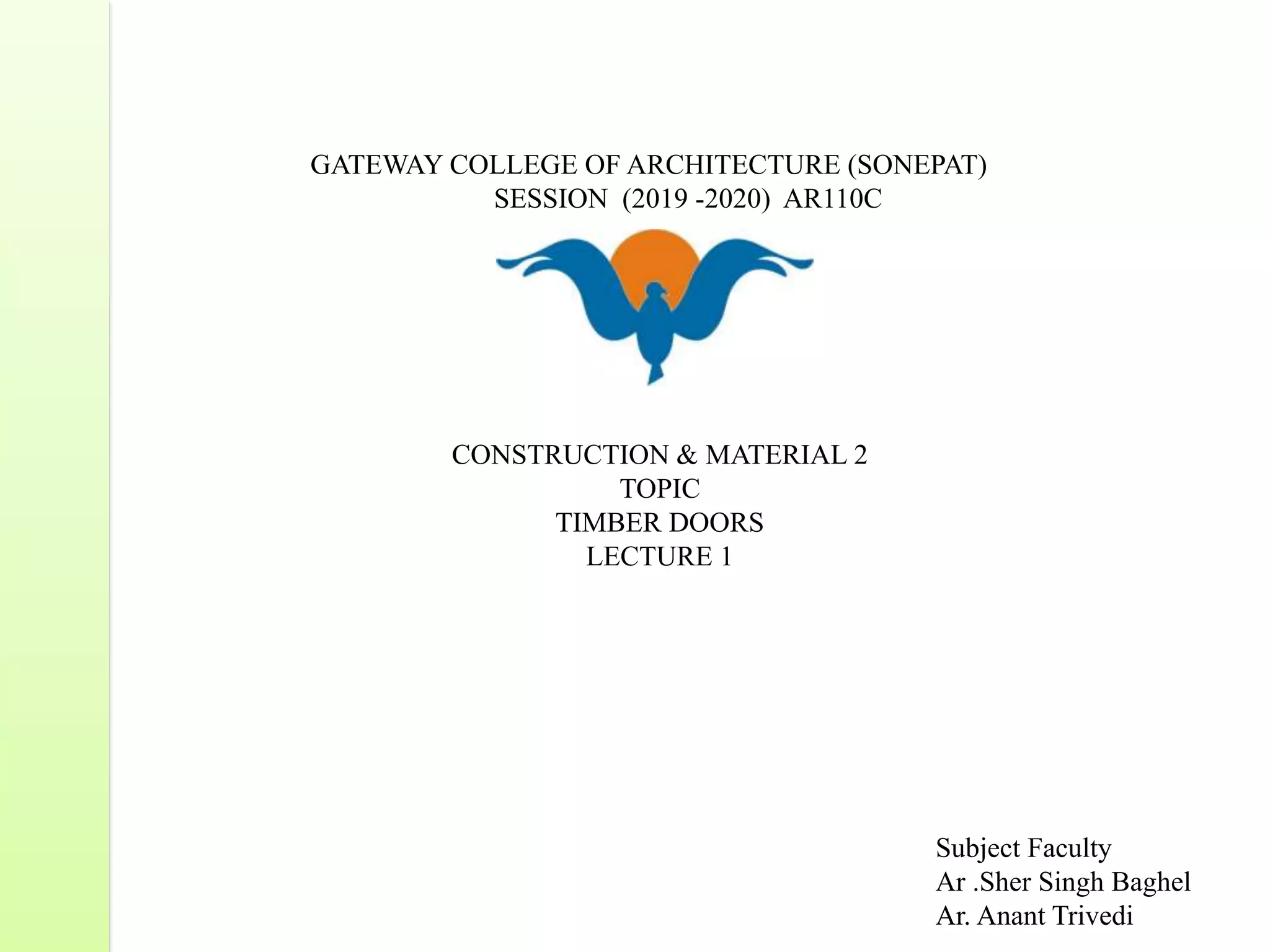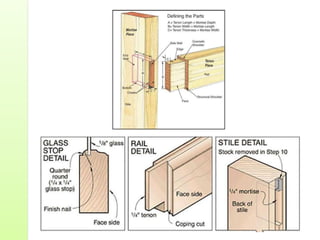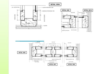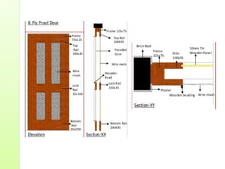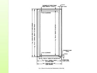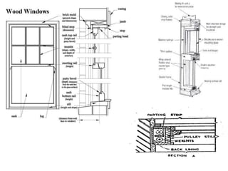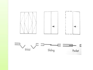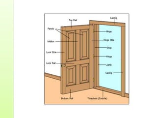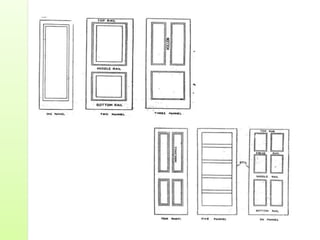 Common door types include panelled doors made of wood frames enclosing timber, glass or louvered panels. Flush doors have a completely flat surface and can be solid core or hollow core varieties. Revolving doors have circular compartments that rotate around a central vertical axis.