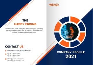 This document is a company profile for Wilmër that includes contact information, an introduction, sections on their mission, featured work, pricing plans, team, services, and testimonials. It provides basic information about the company and what they offer to clients.