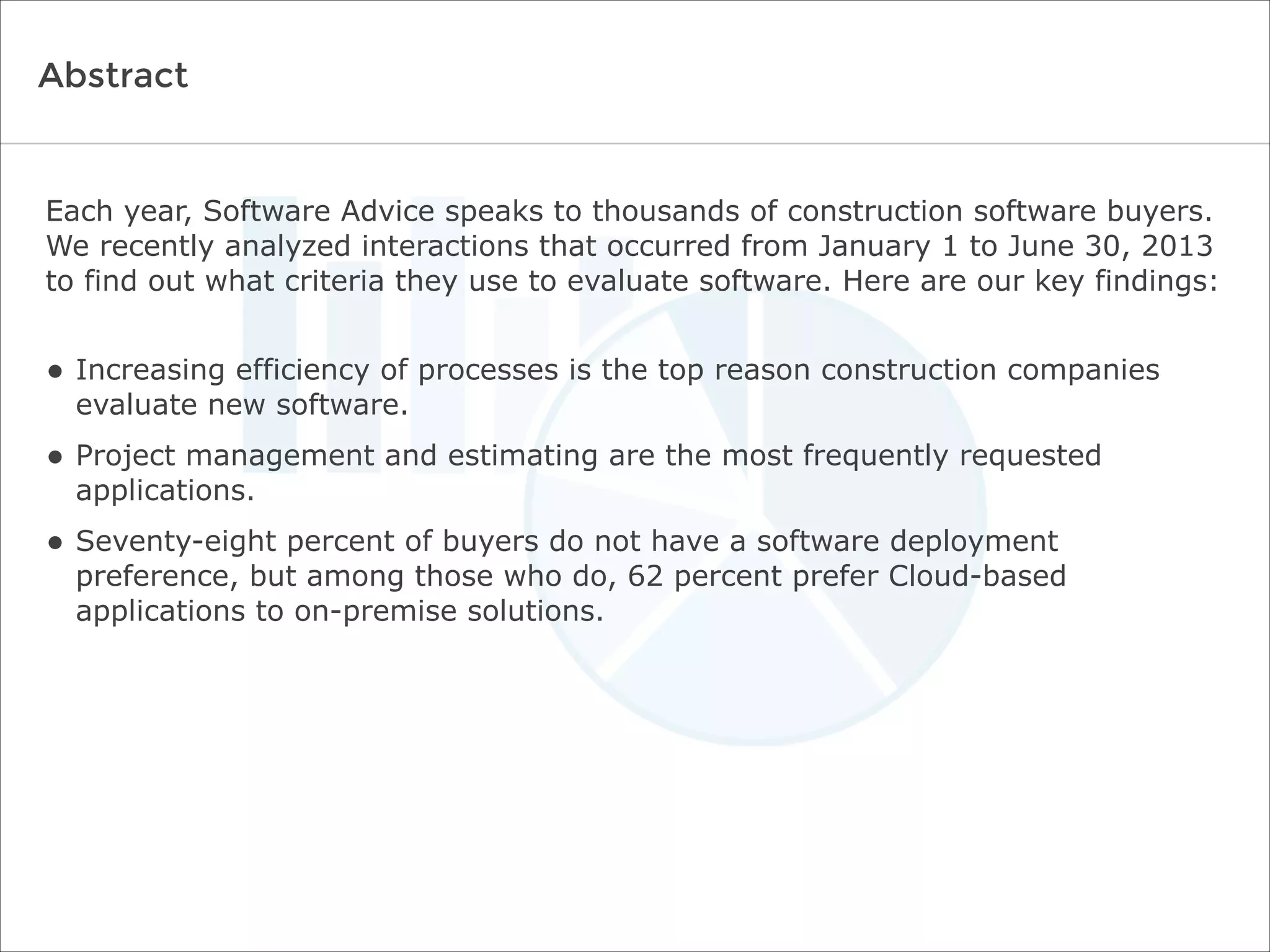 Construction companies are evaluating new software primarily to increase efficiency of processes. Project management and estimating applications are most frequently requested. While most buyers do not have a preference for cloud-based or on-premise software, those that do prefer cloud-based options. Specialty contractors represent the largest segment of buyers.