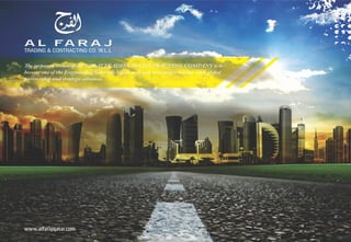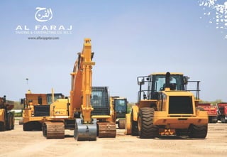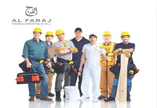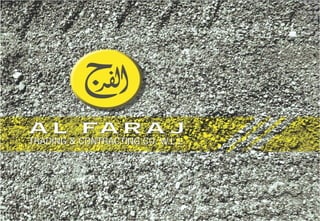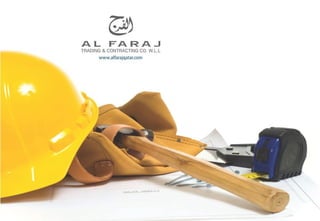 AL-FARAJ Co was established in 1989 to provide maintenance and construction services. It has since expanded to offer various civil, mechanical, electrical, and road construction services. The company aims to provide high quality and timely services through a qualified workforce and latest technologies. It has completed numerous projects for multinational and local clients. AL-FARAJ prioritizes safety, quality, and customer satisfaction in all of its work. It has various subsidiaries and a large inventory of equipment and tools to execute civil infrastructure and construction projects.