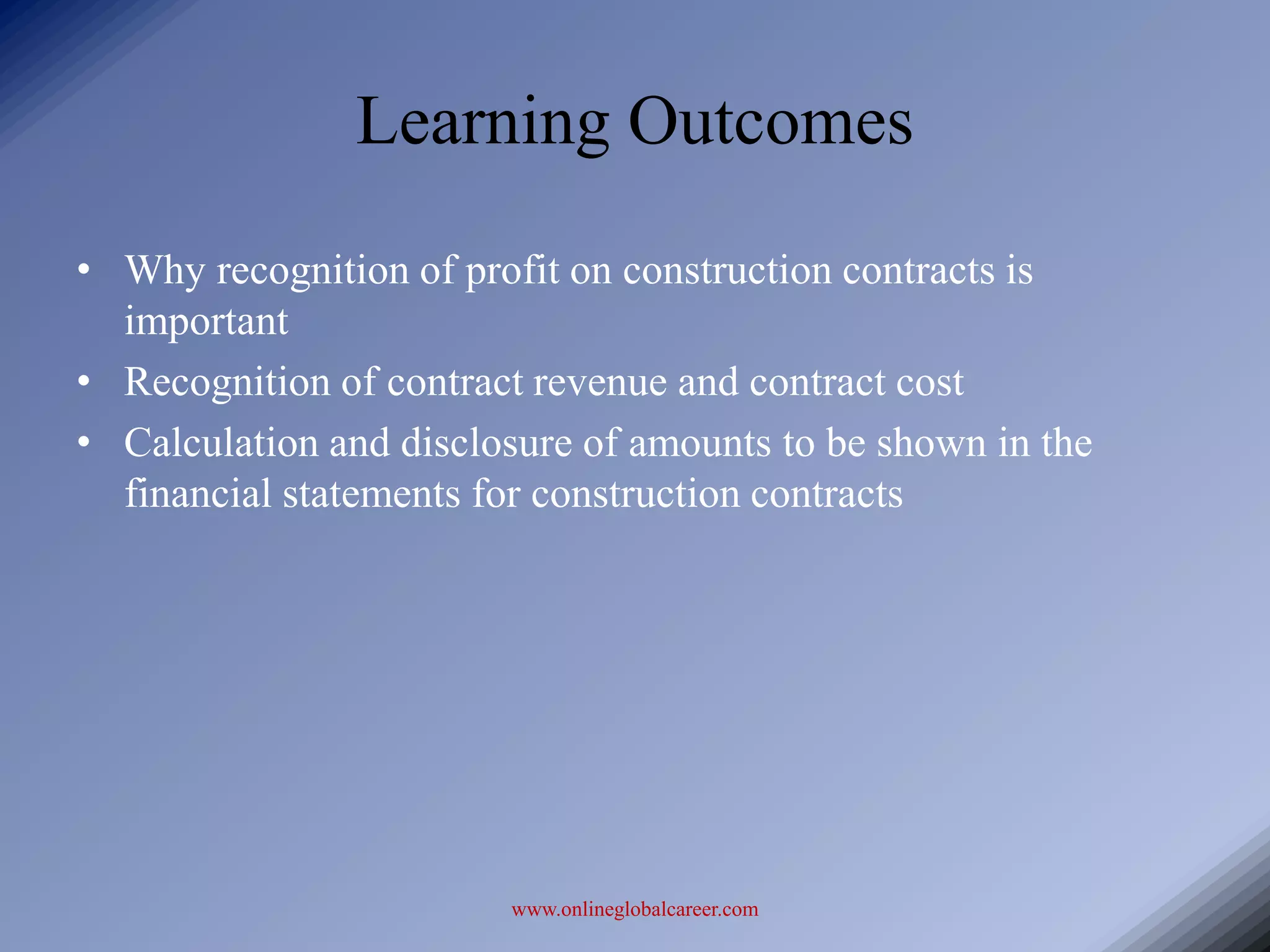 This document discusses accounting for construction contracts under IAS 11. It defines a construction contract, explains how to recognize contract revenue and costs over time using the percentage of completion method when the outcome can be reliably measured. It also discusses how to account for fixed price and cost plus contracts, as well as loss making contracts, contract variations, claims, incentives and how to determine the stage of completion.