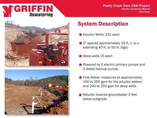 Griffin specializes in dewatering and groundwater control for challenging construction projects using techniques like wells, wellpoints, and relief wells to separate water from soil and control groundwater levels. Proper dewatering is important as it allows for safer and more efficient construction by improving soil properties and intercepting water, while improper dewatering can have consequences like unstable excavations and increased costs. The document then provides details on dewatering methods, considerations for selecting a system, and several case studies of Griffin's dewatering work on large infrastructure projects.