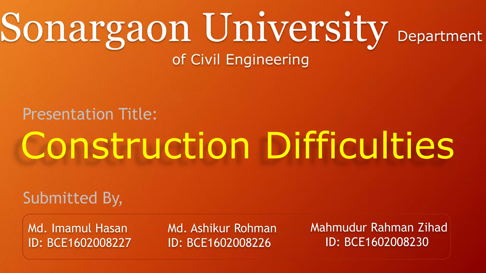 This document discusses various construction difficulties that can arise in project management. It identifies key challenges such as undefined goals, changing scope, lack of accountability, poor risk management, poor communication, unrealistic expectations, and stakeholder indifference. These difficulties can lead to delays, budget overruns, and decreased productivity if not properly managed. The document provides examples of each challenge and emphasizes the project manager's role in mitigating risks through tools like software, clear communication, and setting realistic expectations.