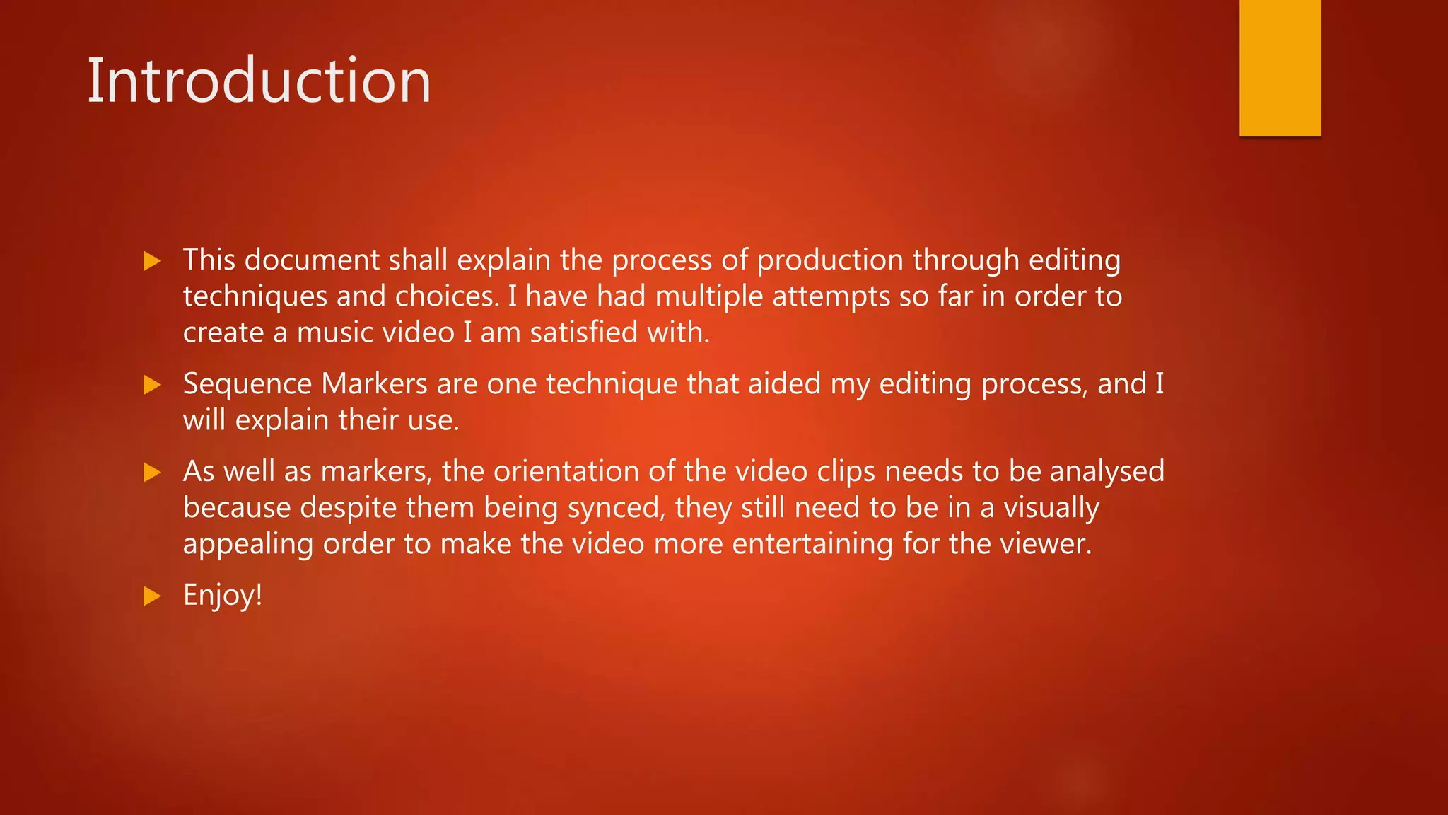 The document discusses the editing process for creating a music video. Sequence markers were used to aid editing and sync clips to the beat of the song. Multiple rough cuts were made, incorporating feedback each time to improve the video. This included shortening shot lengths, adding more shots of the vocalist, and increasing the pace through additional cuts. Using markers and creating several edits allowed for testing different structures and orientations to ultimately produce the best final cut.