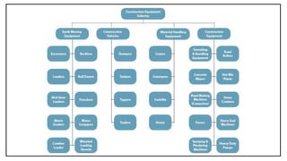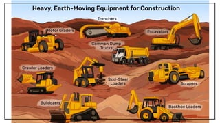 The document discusses various types of construction equipment used in building projects. It describes earthmoving equipment like excavators, loaders, graders, backhoes, trenchers, and bulldozers which are used to dig foundations, shift earth and create flat surfaces. It also mentions construction vehicles like trailers, dumpers, and tippers which transport goods and materials. Additionally, it outlines material handling equipment such as cranes, forklifts, conveyors, hoists and gantry cranes used to lift and move heavy objects. Finally, it briefly describes other equipment like jaw crushers, spraying machines, pumps and pile driving tools used in specific construction tasks.