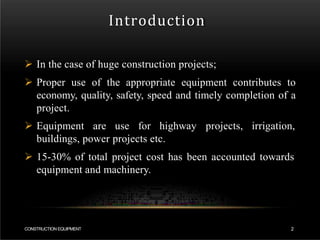 This document provides an overview of various types of construction equipment used in large projects. It begins by explaining how proper equipment selection contributes to project economy, quality, safety and timely completion. It then classifies common equipment into categories like earth-moving, hauling, hoisting, conveying, aggregate production and more. Specific equipment types are described in detail, including their applications and comparisons. The document provides a comprehensive reference for understanding the different equipment used in construction.