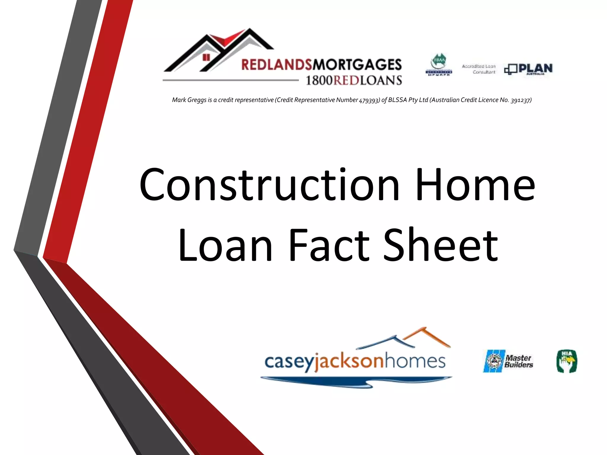 This document provides information about construction loans from Redlands Mortgages and working with Casey Jackson Homes to build a home. It outlines the key steps in the construction loan process including drawing up building plans and contracts, approving the loan, making progress payments aligned to milestones, applying for grants, allowing access to the building site, managing variations, completion inspection, and transitioning to principal and interest repayments after construction is finished.