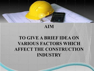 The document discusses several factors that affect the construction industry, including local and global environments, its relationship to the economy and employment. It outlines objectives to regulate and standardize construction activities. The construction industry is influenced by various local codes and regulations. It also discusses the roles of various professionals that make up the building team, such as architects, engineers, contractors and material suppliers. The construction industry impacts economies through government fiscal and monetary policies. It is an important source of employment but also faces issues like worker safety and disputes.