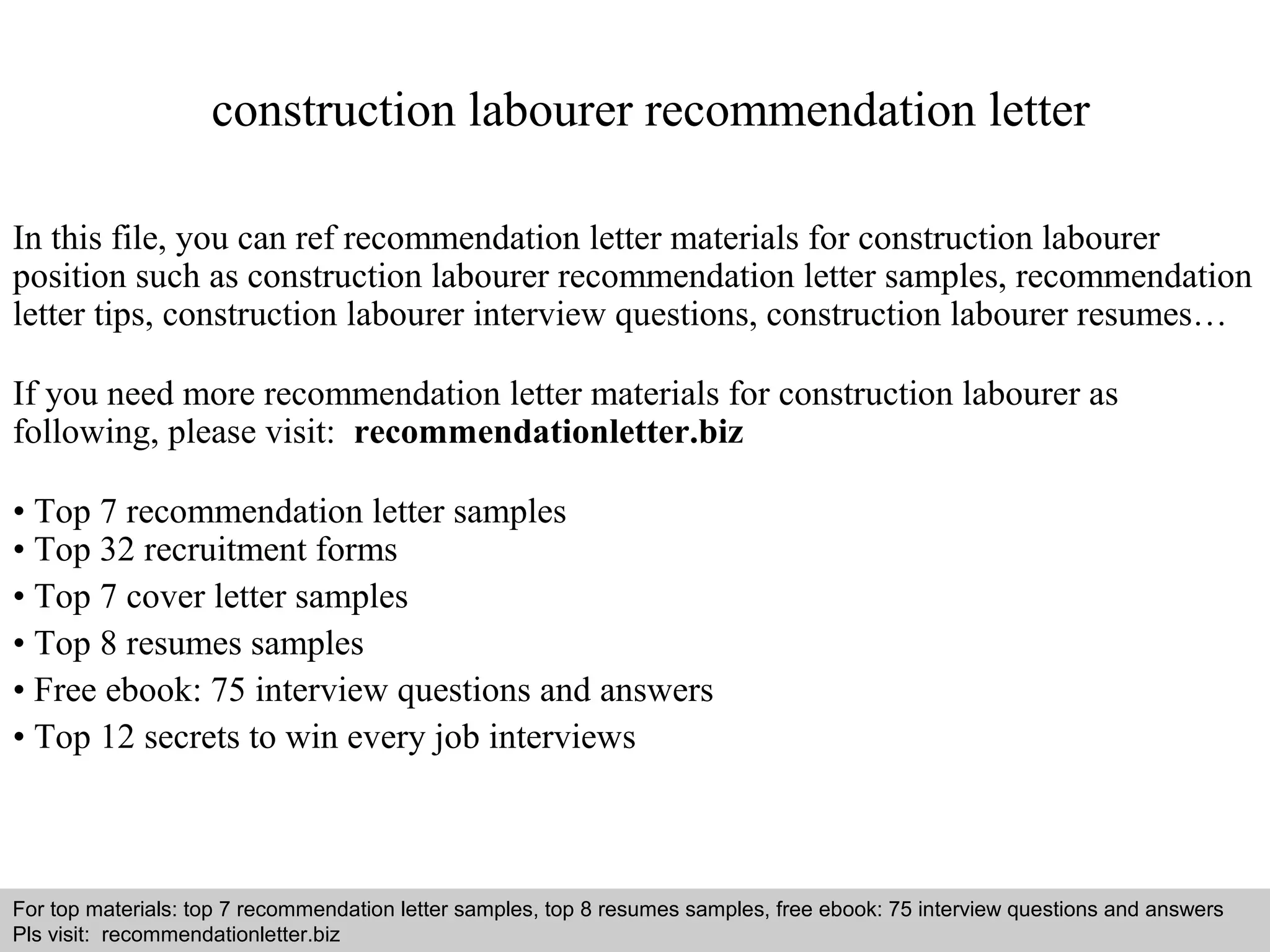 This document provides resources for writing a recommendation letter for a construction laborer position, including samples, tips, interview questions, resumes, and other job search materials. A recommendation letter sample is given for a construction laborer applicant praised for his quick learning, hard work, passion, and willingness to take on new challenges. The document directs the reader to an online site for additional recommendation letters, resumes, interview guides, and other top materials to aid in the job search and application process for construction laborers.