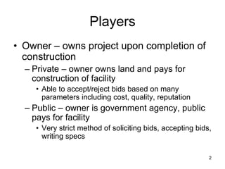 This document provides an overview of construction management, including the key players involved and the typical stages of a construction project. It discusses the owner, design professionals, contractor, and project management. It then outlines the characteristics of a construction project and the steps needed to plan and execute it. The document also categorizes different types of construction projects and provides a chronology of the typical project stages. Finally, it discusses project risks and different types of construction contracts.