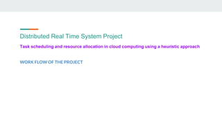 The document discusses a project that proposes a heuristic algorithm for efficient task scheduling and resource allocation in cloud computing environments. It uses real scientific workflows as input tasks and compares the turnaround and response times to other frameworks, finding the proposed algorithm performs better. The algorithm aims to maximize resource utilization, including CPU, memory, and bandwidth, obtaining the highest utilization results for these computing resources.