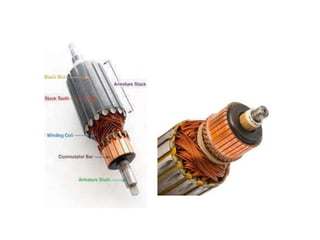 The document summarizes the key components of a DC machine, including the yoke, pole cores and shoes, pole coils, armature core, armature windings, commutator, brushes, bearings, and shaft. The yoke provides mechanical support and carries magnetic flux. Pole coils electromagnetize the poles when current flows through them. The armature core houses windings and rotates to cut magnetic flux. The commutator rectifies alternating current from the windings into direct current for the load. Brushes housed in holders collect current from the commutator.