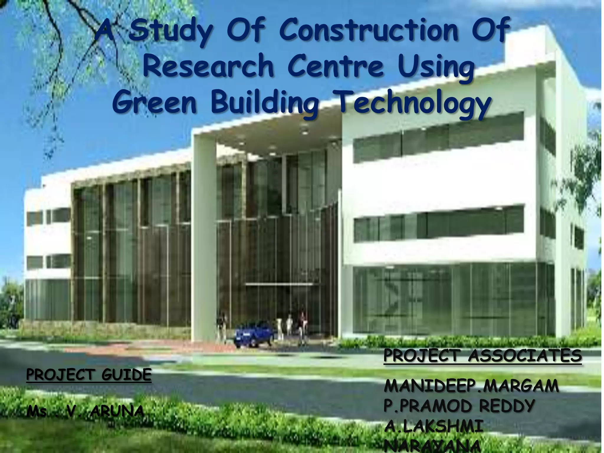 The document outlines a study on the construction of a research center using green building technology, emphasizing the environmental benefits like energy and water conservation compared to conventional buildings. It details the design methodology, structural requirements, eco-friendly materials, and the parameters for safety and sustainability. The center aims to facilitate energy-efficient operations while creating an interactive academic environment through various innovative features and certifications.