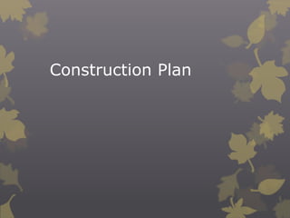 The document outlines a construction plan with four main phases: research, planning, construction, and evaluation. In the research phase, the group will research audience preferences, conventions of the genre, existing music videos and packaging, and production techniques. The planning phase involves developing initial ideas, storyboarding, scheduling, and securing permissions. In the construction phase, the group will film the music video, design packaging, edit the video, and ensure all elements work together according to schedule. Finally, the evaluation phase will include creative self-evaluation of the project and individual roles.