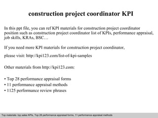 This document discusses key performance indicators (KPIs) for construction project coordinators. It provides examples of KPIs, performance appraisal forms, and the key result areas (KRAs) that should be evaluated. The document recommends that KPIs be linked to strategy, answer important questions, and empower employees. It also warns against creating too many KPIs and notes that KPIs should change based on goals and project stage. Additional materials on KPIs can be found on the listed website.