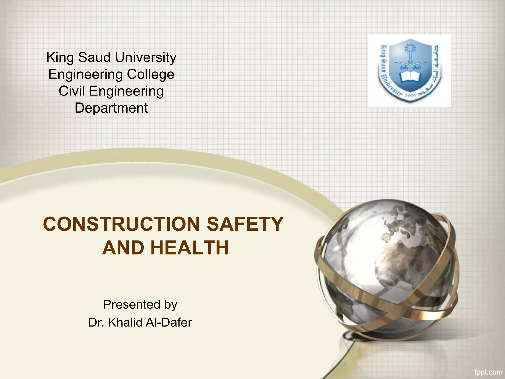 This document discusses construction safety and health. It defines key safety terms like accident, injury, hazard, and risk. It outlines common causes of construction accidents such as unsafe acts and unsafe conditions. The importance of safety is discussed in terms of human, financial, and regulatory factors. OSHA regulations are summarized, including record keeping, penalties for violations, and requirements for safety programs and procedures. Major elements of effective safety programs and procedures to prevent common accidents are also presented.