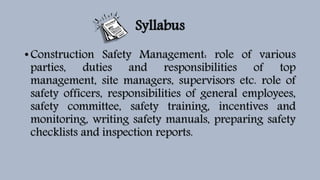 This document discusses construction safety management. It covers the roles and responsibilities of various parties in ensuring construction safety such as top management, site managers, supervisors, safety officers, and general employees. It also discusses approaches to improving safety through organizational, physical, and behavioral changes. Key aspects of safety management discussed include developing safety manuals, committees, training programs, inspections, investigations, and incentives.