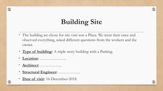The document details a site visit to a triple-story building under construction, observing various materials and their specifications, such as bricks, aggregates, cement, and concrete mixes. Key structural insights include the building's frame structure, the progress of construction on each floor, and specific design features of the flats. The observation also mentions the design and dimensions of individual flats, including room sizes and an open kitchen layout.