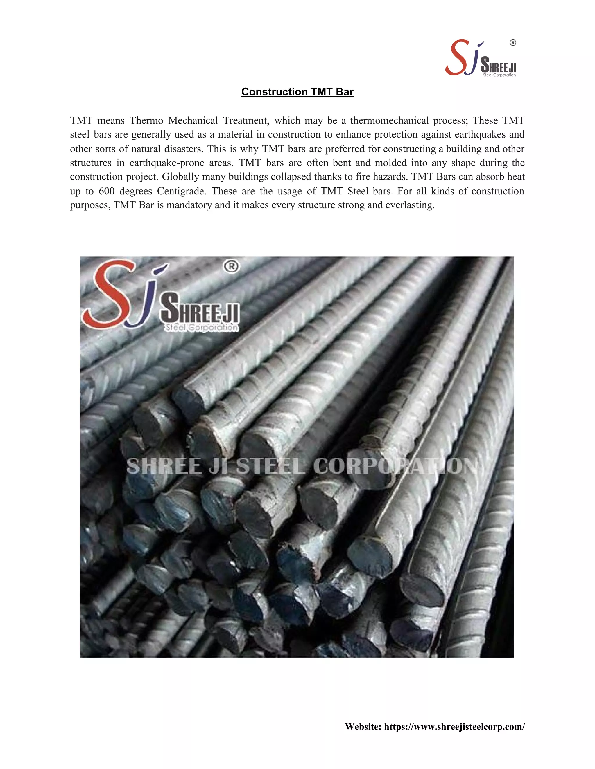 TMT bars, or thermo-mechanical treated steel bars, are essential in construction for their strength and ability to withstand heat and natural disasters, making them vital in earthquake-prone areas. They can be molded into various shapes and offer improved safety and durability for structures. The document details the mechanical and chemical properties, sizes, and weights of TMT bars, emphasizing their suitability for construction purposes.