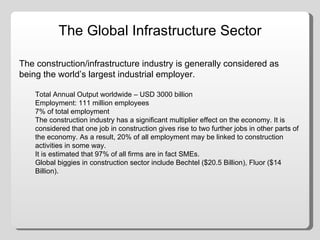 The document discusses India's infrastructure sector across various industries. It notes that infrastructure contributes 7% to India's GDP and accounts for 2% of the global construction market. Major areas of focus and investment include power generation, roads, railways, airports and ports. The government has launched various schemes and public-private partnerships to develop infrastructure and attract private sector investment in transportation, energy and physical infrastructure projects across the country.