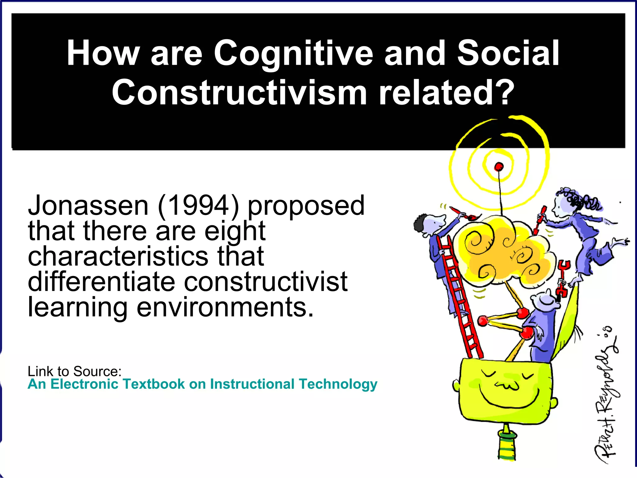 Jonassen proposed eight characteristics that differentiate constructivist learning environments which are supported by both cognitive and social constructivism. However, cognitive and social constructivism emphasize these characteristics differently, with social constructivism placing more emphasis on collaborative knowledge construction through social negotiation. The eight characteristics include providing multiple representations of reality, emphasizing knowledge construction over reproduction, using authentic tasks in meaningful contexts, and enabling context-dependent and socially constructed knowledge.