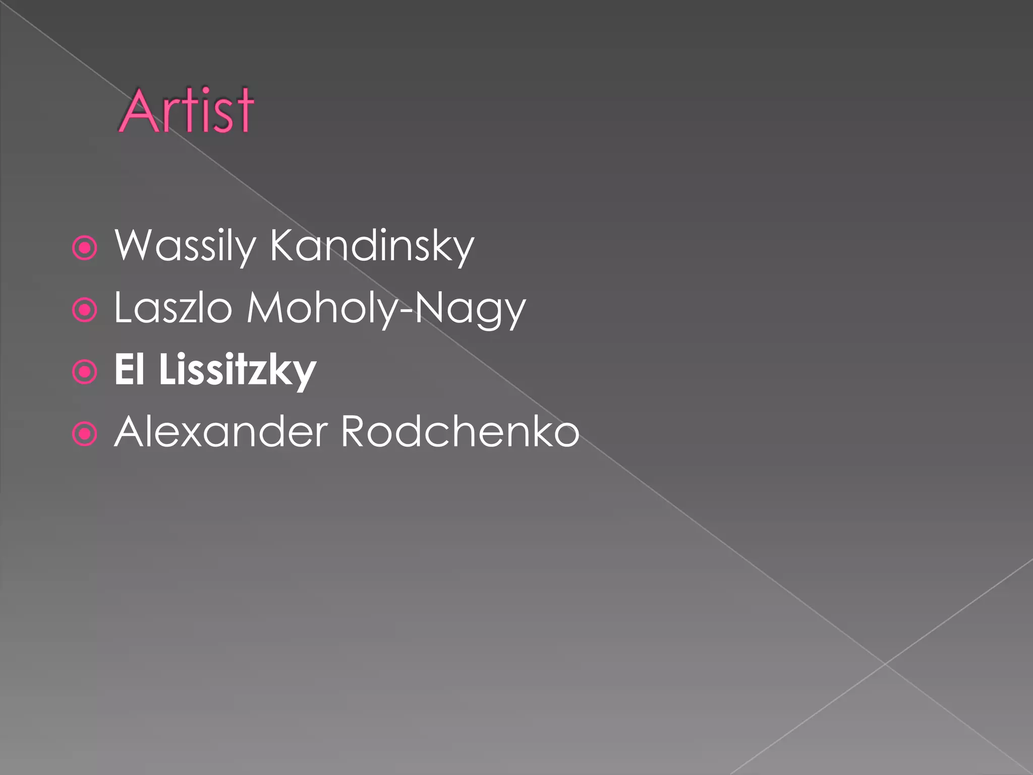 Constructivism was an avant-garde art movement that originated in Russia in the 1910s-1920s. It sought to reject the past and create an art that promoted order, unity, and peace. Key artists included Wassily Kandinsky, Laszlo Moholy-Nagy, El Lissitzky, and Alexander Rodchenko, who created reductive works using basic geometric elements that explored the relationship between art and its social function.