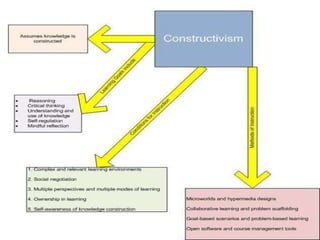 This document discusses constructivism as it relates to knowledge construction and concept learning. It outlines key aspects of constructivism including influential figures like Piaget, Bruner, Vygotsky, and Dewey. It describes individual and social constructivism and characteristics like learners constructing understanding based on prior knowledge and learning being facilitated by social interaction. The document also discusses organizing knowledge through concepts defined by features, prototypes, and exemplars. It provides tips for effective concept learning including defining concepts, using examples, and relating concepts to each other. Finally, it discusses applying constructivism by making learning hands-on and relating topics to real life.