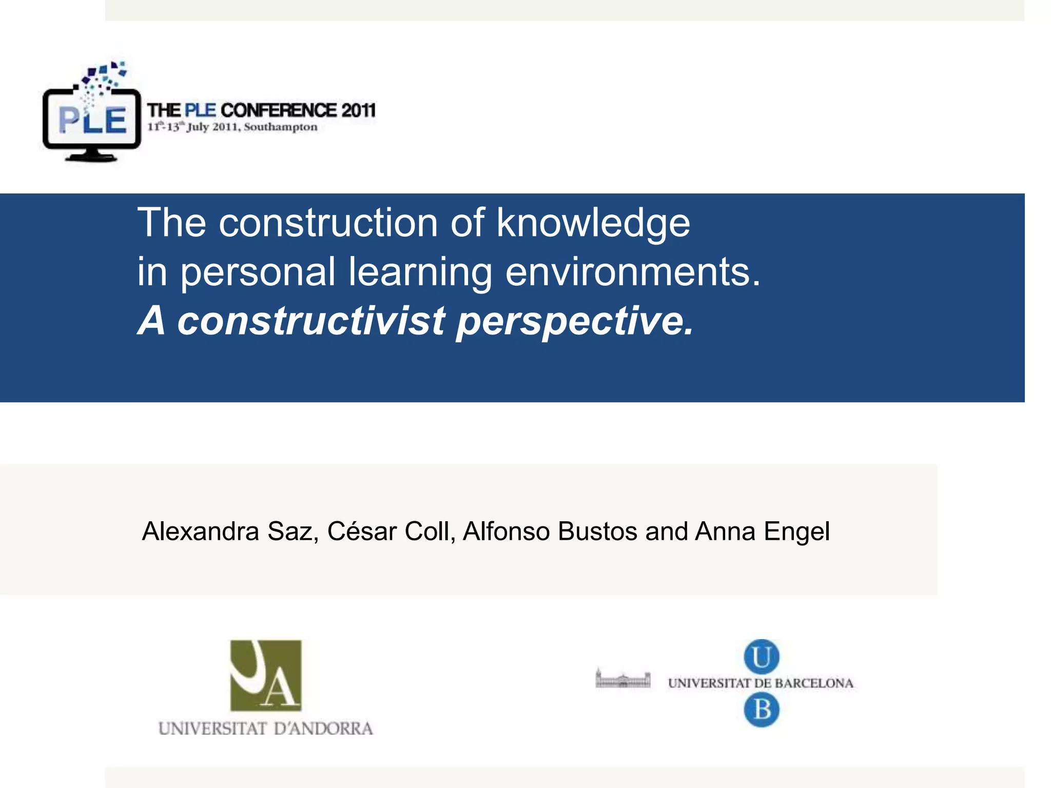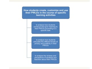 This document summarizes a pilot study on the construction of knowledge in personal learning environments from a constructivist perspective. The study examined a platform for communication and learning called Personal Working and Learning Environments (PWLE) that provides 25 tools for students. Data was collected through student interviews and teacher views to analyze social cognitive processes and different privacy levels in using the tools. Initial results and conclusions from the study suggest areas that could be improved in future research.