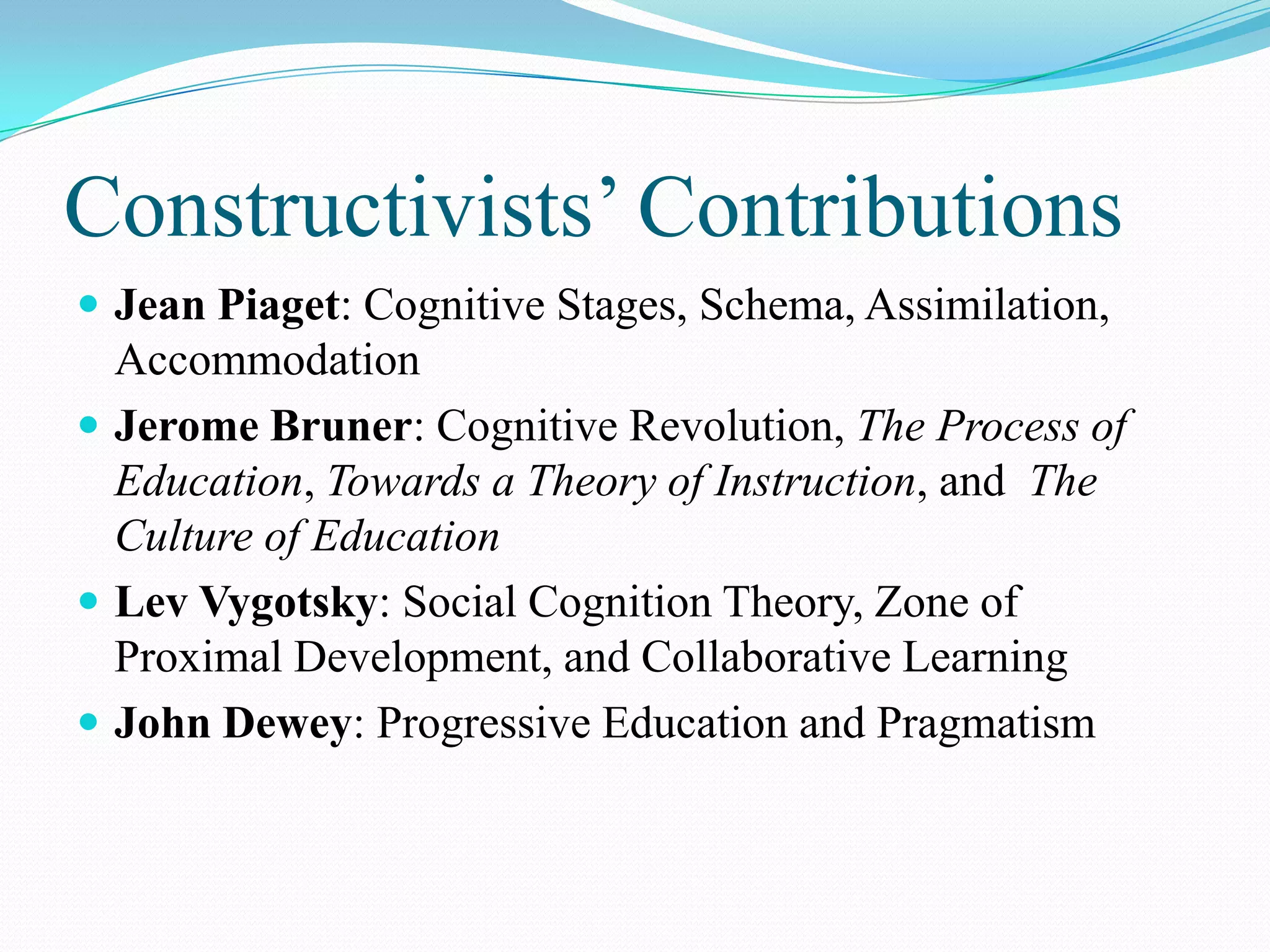 This document summarizes the constructivist contributions of several theorists including Piaget, Bruner, Vygotsky, and Dewey. It discusses key concepts from each theorist such as Piaget's cognitive stages and schema, Bruner's emphasis on readiness and a spiral curriculum structure, Vygotsky's zone of proximal development and social cognition, and Dewey's view that understanding comes from meaningful experiences. The document also outlines two principles of constructivism and how a constructivist approach can be implemented in the classroom by setting problems for student exploration and referring to primary sources.