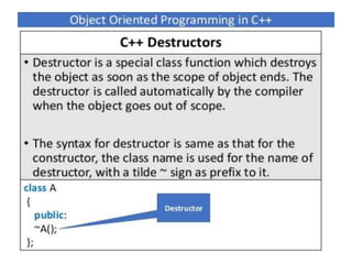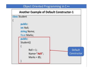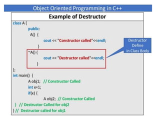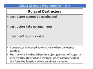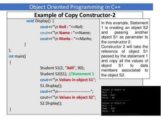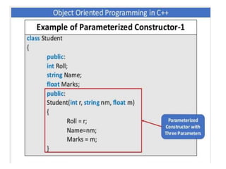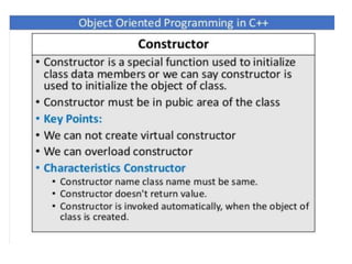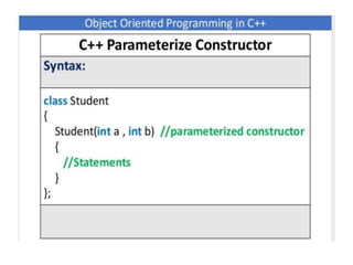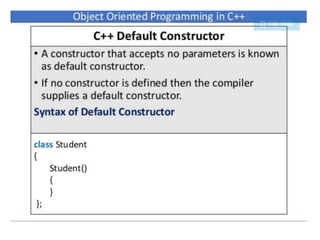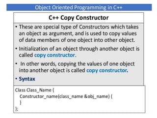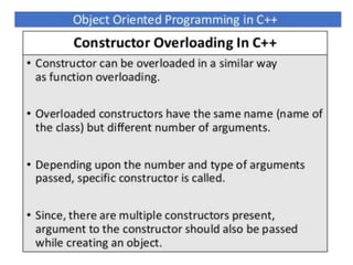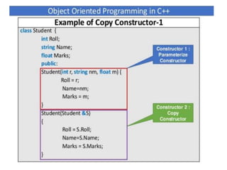 This document discusses different types of constructors in C++, including default, parameterized, and copy constructors. It provides examples of how to define each type of constructor and demonstrates their usage when creating objects. Destructors are also covered, along with an overview of their purpose to destroy objects and free allocated memory. Constructor overloading and the use of the "this" keyword in C++ are further explained with additional examples.