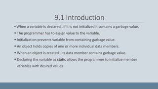 This document discusses constructors and destructors in C++. It explains that constructors initialize objects when they are created and prevent data members from having garbage values, while destructors destroy objects before they go out of scope. The document covers parameterized and copy constructors, constructor overloading, default constructor arguments, and how constructors and destructors are automatically called by the compiler. It also discusses dynamically initializing data members using constructors with pointer arguments.