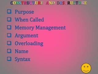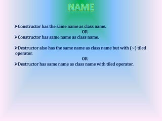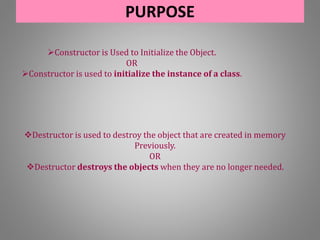 Constructors are used to initialize objects when they are created and allocate memory, while destructors destroy objects when they are no longer needed and release memory. Constructors can take arguments but destructors cannot, and constructors can be overloaded but destructors cannot. Constructors are called when a new class instance is created and destructors are called when an instance is deleted.