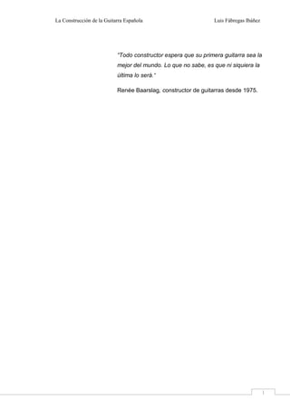 El documento describe el proceso de construcción de una guitarra española. Explica cómo se construyeron las herramientas necesarias, incluida una plantilla mediante la cual se trazó la silueta de la guitarra. Luego detalla los pasos para construir el fondo, la tapa armónica, el mástil y los flancos, antes de ensamblar todas las piezas. El autor basó su investigación en un libro y documentó fotográficamente cada etapa del proceso experimental.